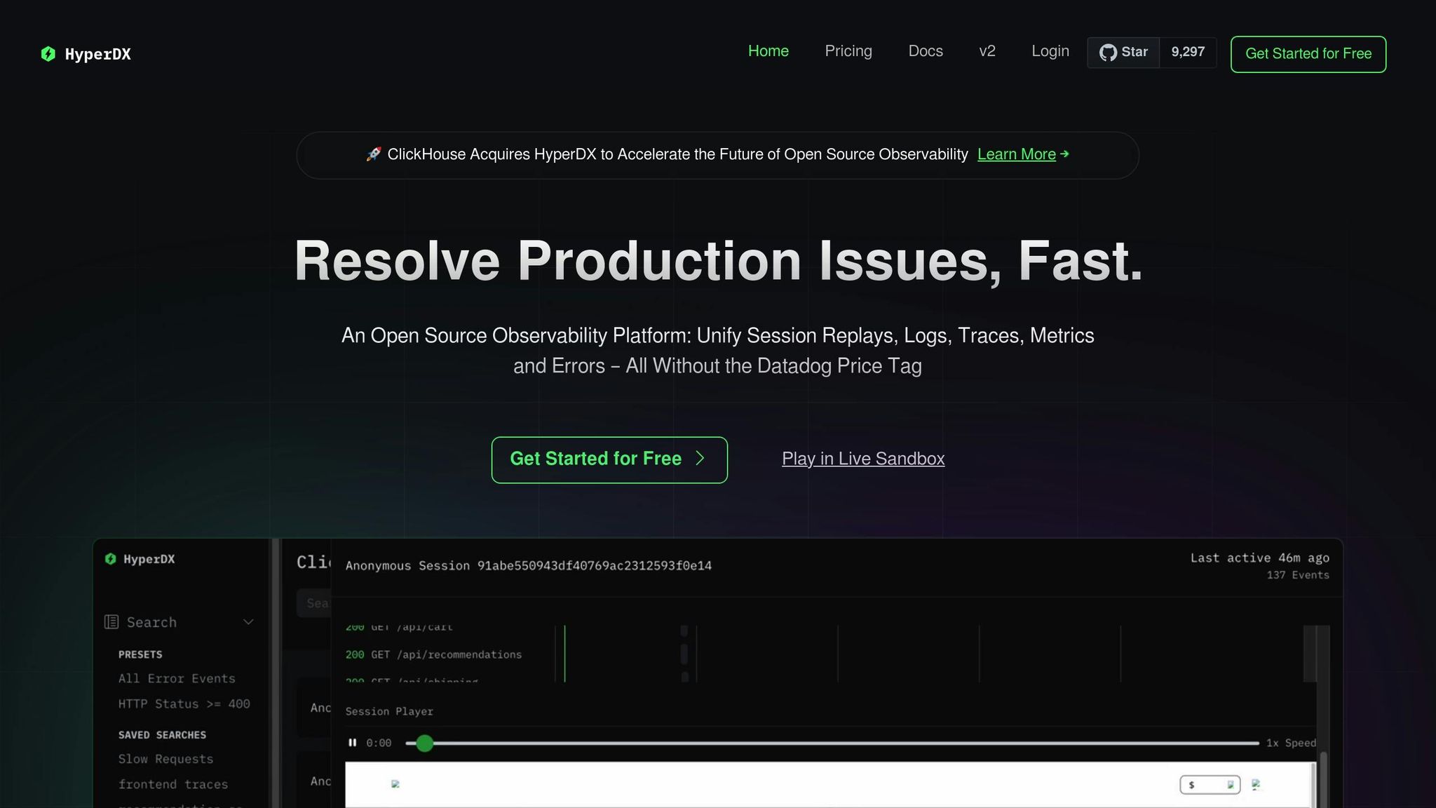 A standout feature is session replay, which directly connects frontend recordings with backend traces and logs. This functionality often requires multiple tools in other platforms. Recently, HyperDX was acquired by ClickHouse, reinforcing its commitment to advancing open-source observability.