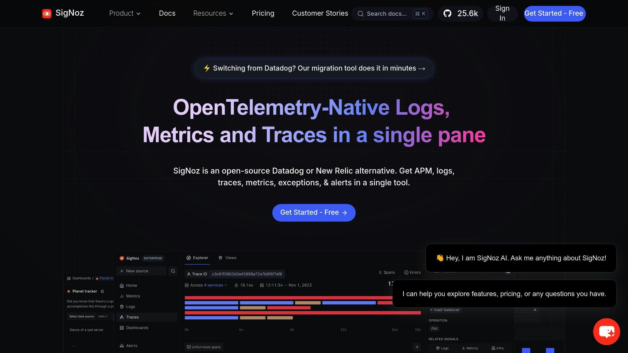 SigNoz provides a free self-hosted Community Edition alongside budget-friendly cloud plans. With over 25,000 stars on GitHub and more than 10 million open-source downloads, it's a favorite among developers seeking full-stack observability without the recurring costs of SaaS platforms [15].
