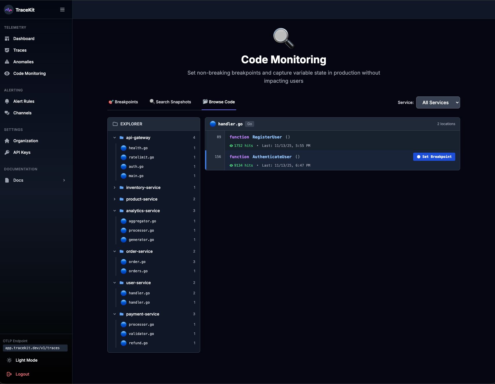 Live breakpoints with TraceKit introduce a fresh way to debug by capturing real-time snapshots of your application's state. This includes stack traces and variable values, all without pausing or interrupting the running code. Unlike traditional debugging methods that often require halting the application or redeploying, live breakpoints let you address issues directly within production environments.