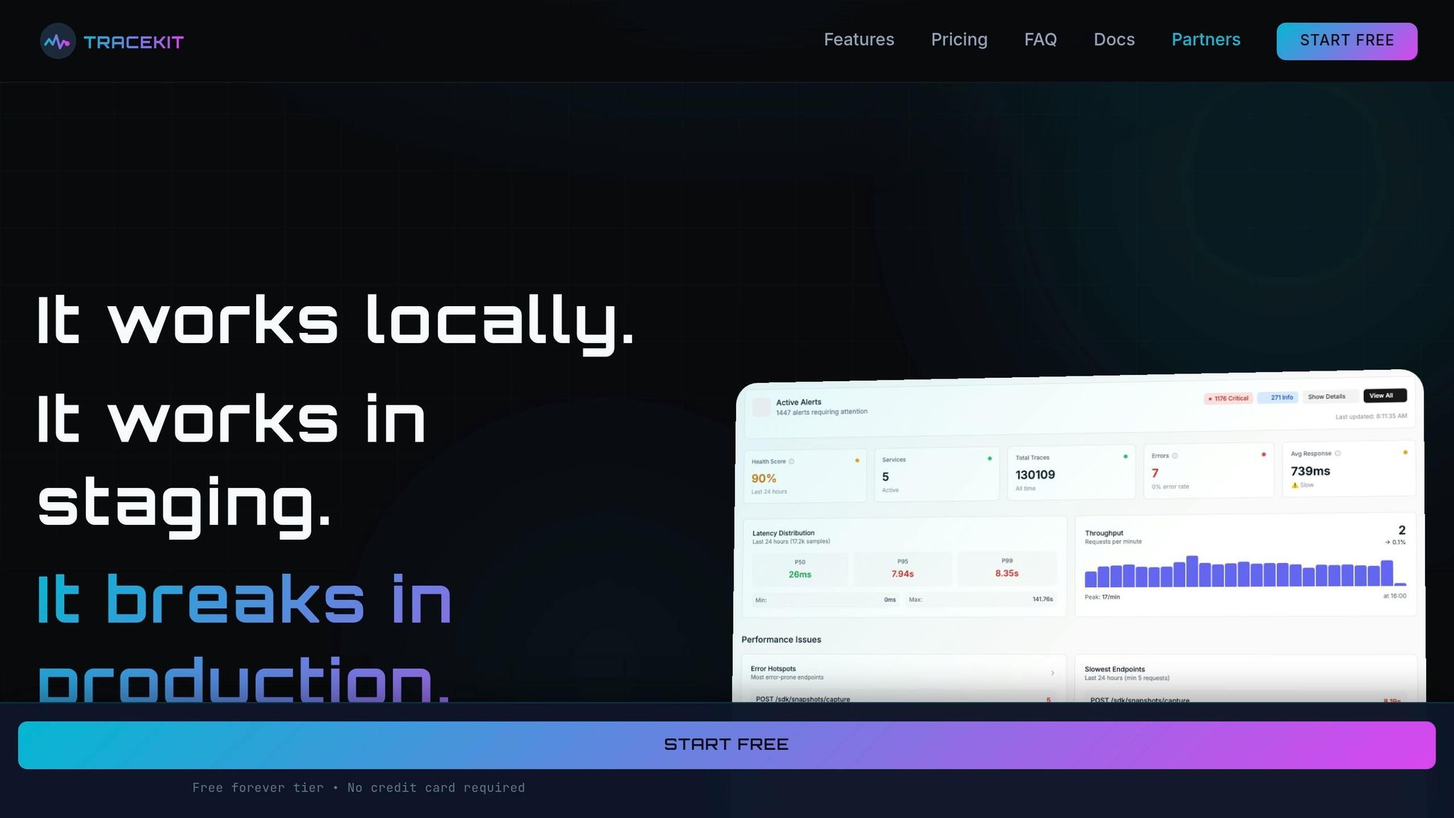 The benefits of these modern techniques are clear, especially when it comes to cost and performance. For small teams, affordability is critical. While enterprise tools like Datadog can exceed $500 per month, TraceKit delivers similar capabilities for just $29/month for 1,000,000 traces - enough to handle about 100,000 requests daily. For students and early-stage projects, the free tier provides 200,000 traces per month [9]. Real-world examples further highlight its value: one e-commerce site used TraceKit to cut checkout times from 5.2 seconds to just 900ms - an 82% reduction - by identifying bottlenecks like blocking email sends and redundant tax API calls [1].