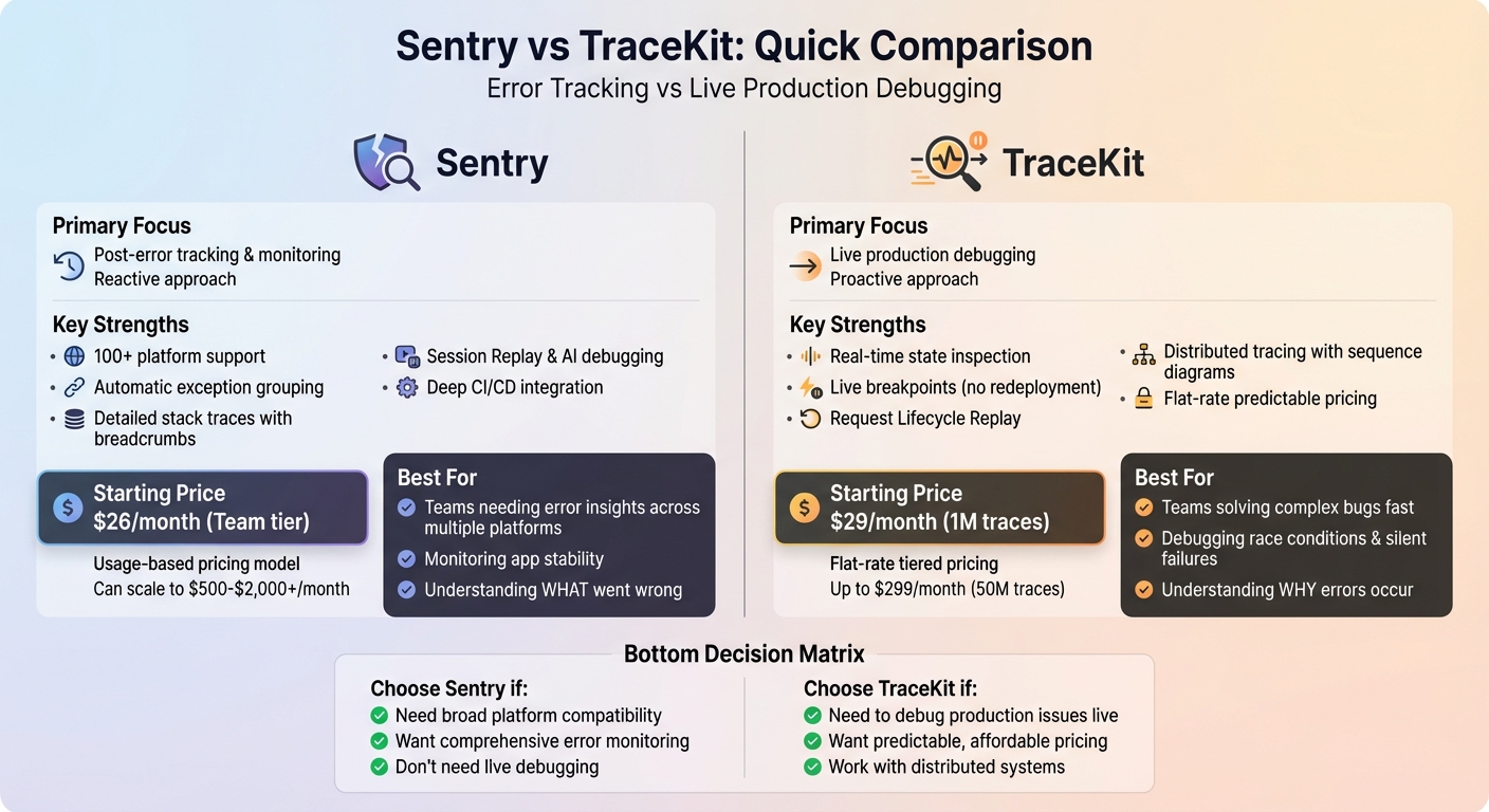This breakdown makes it easier to see where each tool shines: Sentry excels at reactive error tracking, while TraceKit is better suited for proactive, real-time debugging.